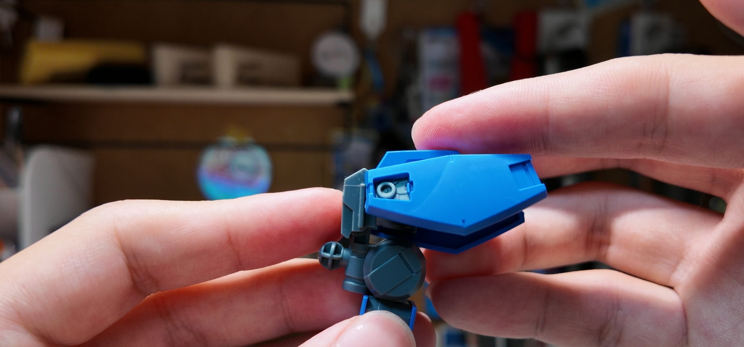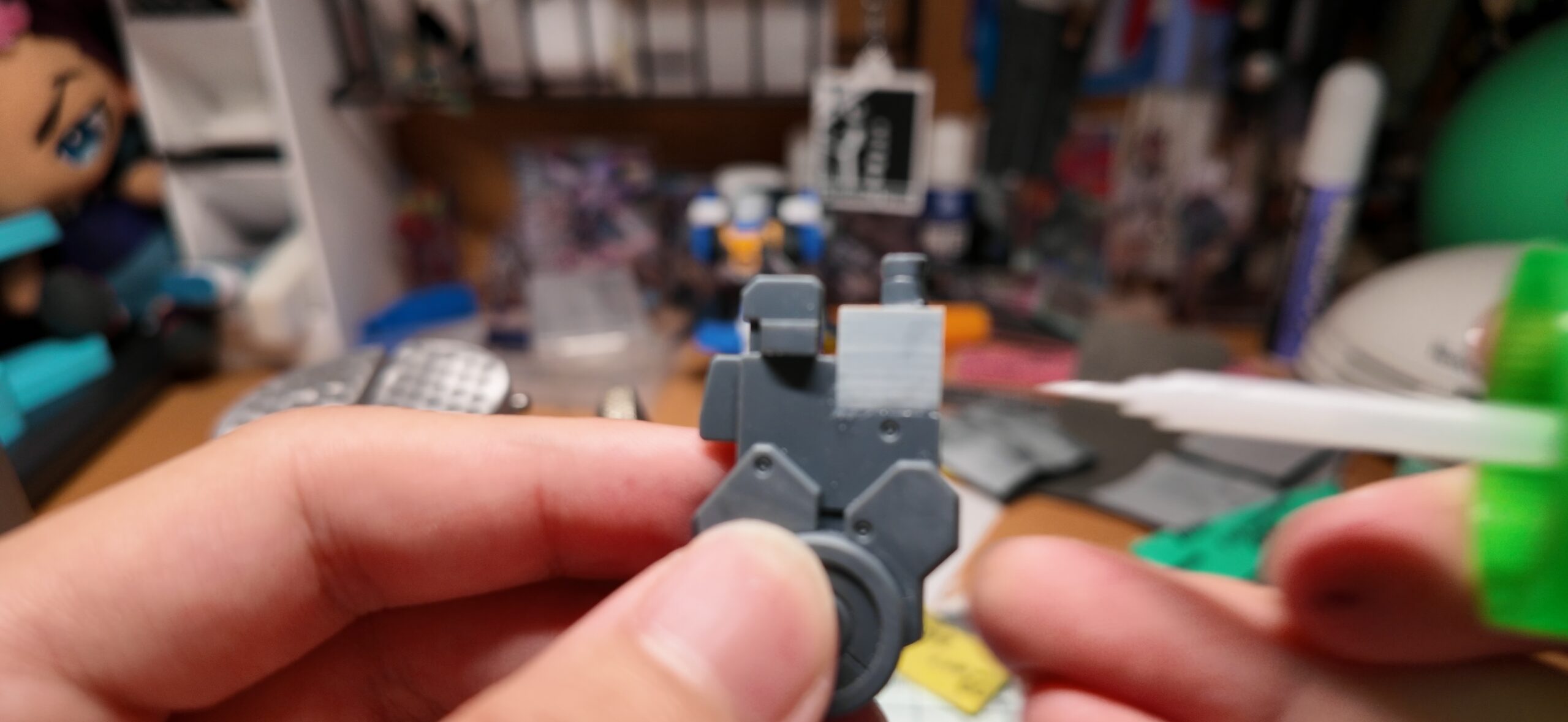 メインカメラの下にあるいかにもメインっぽい補助カメラはもとのままだと可愛すぎるから、スラスターの縁を接着。我ながらセンスある。