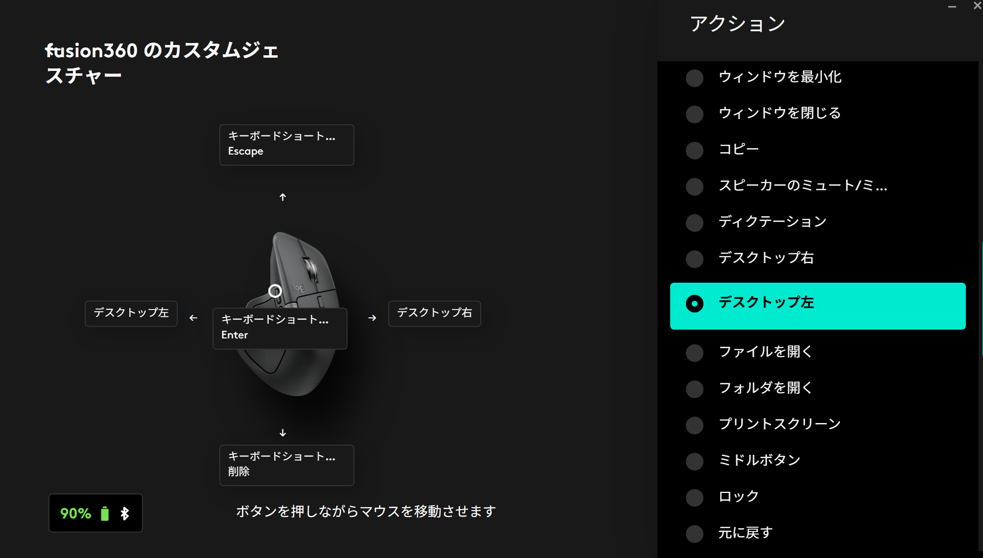 その奥のボタンがすごい。ボタンを押しながらマウスを左右上下の4方向に動かしたときのジェスチャーに機能を割り当てることができる。つまりこのボタンだけでボタン5つ相当の働きをしてくれる。